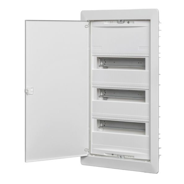 Unterputz-Kleinverteiler mit Steckklemmen,PE 6 x2,5-16 + 21 x1,5-4mm²,N+N 2 x(3 x2,5-16 + 14 x1,4-4mm²),zusätzliche N-FI-Klemme 3 x16,2 x10mm²,Blendrahmen BxHxT (mm) 344 x624 x11,Nischenmaße BxHxT (mm) 330 x585 x90,TE je 18mm 36/42,Reihen 3,Unterputz-Kleinverteiler,Schutzisoliert II,Schutzart: IP 30,Für Geräte bis 63A,Farbton: RAL 9016,verkehrsweiß,Einfachster Türanschlagwechsel ohne Demontage des Blendrahmens,Flacher Türverschluss mit Schnapptechnik,EinfachesAustauschen gegen ein Schloss,Geeignet für Einbaugeräte bis 70mm Tiefe,Gebaut nach DIN VDE 0603-1,DIN 43871,MauerkastenAus Kunststoff,mit GerätetragschieneAus Stahlblech,Tiefe 88/90mm,N/PE-Steckklemmen,fingersicher in montagefreundlicher Schnapptechnik,N-FI-Erweiterungsklemme,serienmäßig für 2-,3- und 4-reihige Verteiler zur seitlichen Schnappbefestigung enthalten,Geräteabdeckung mit Geräteausschnitten,H = 46mm,für 12 TE,(symmetrisch erweiterbarAuf 14 TE),Plombierbar,2-Punkt-Befestigung,Blendrahmen mit VolltürAus Stahlblech,Stromkreisbeschriftungen und Blatt mit Piktogrammen,Putzschutzplatte,