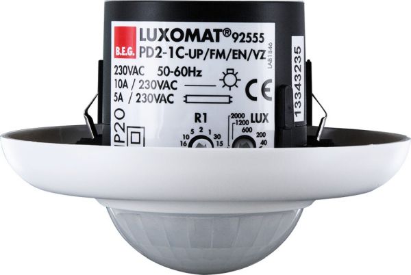 Präsenzmelder mit einem potentialfreien Kontakt, Ausführung als Master-Gerät, Ein Kanal zum Schalten von Licht, Erweiterung des Erfassungsbereiches mit Slave-Geräten möglich, Manuelles Schalten über Taster möglich, Weitere Funktionen über optionale Fernbedienung einstellbar, Werkseinstellung 10 min und 500 Lux