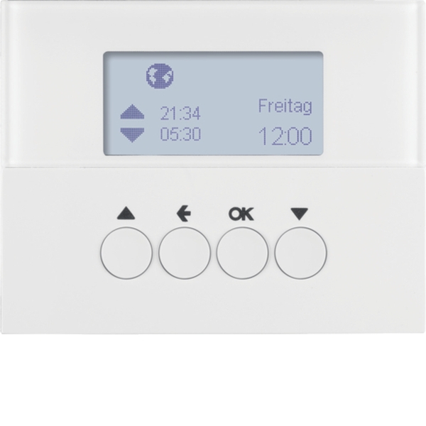 Jalousie-Schaltuhr K.1 für Unterputz-Installation, polarweiß, glänzend, integriertes LC-Display. Ermöglicht programmierbare Steuerung von Rollläden mit Astro- und Ferienprogramm. Features: automatische Sommer-/Winterzeit-Umschaltung, Tastensperre, individuell einstellbare Menüsprachen (DE, EN, FR), sowie Demontageschutz. Ideal für effiziente und komfortable Fensterabdeckungssteuerung.