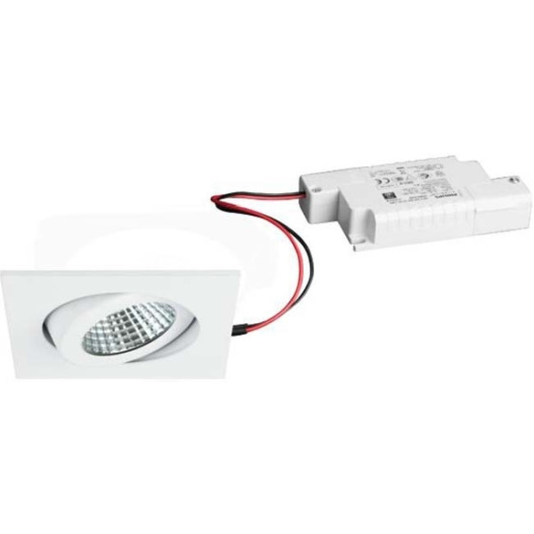 LED-Einbaustrahlerset, IP65, Phasenabschnitt dimmbar, weiß, quadratisch. Ausgeführt in kompakter Bauform für werkzeuglose Schnellmontage zum Deckeneinbau. Set inkl. Konverter für 230 V-Netzspannung, Phasenabschnitt dimmbar, Maße Konverter: L 110 x B 50 x H 19 mm Montageart: Einbaumontage, Montageort: Deckenmontage, Material: Aluminium / Stahl / Silikonkautschuk / Polycarbonat, Schutzart raumseitig: nach DIN EN 60529: IP65, Schutzklasse: (EN 61140) II, Spannung: 230V AC 50Hz, Leistung: 6 W, Anzahl der Leuchtmittel / Fassungen: 1 Stück, Lichtstrom: 650 lm, Farbtemperatur: 3.000 K, Abstrahlwinkel: 38°, Verstellbarkeit: schwenkbar, Mit Betriebsgerät: Ja, Dimmbar: Ja, Art der Dimmung: Phasenabschnitt.