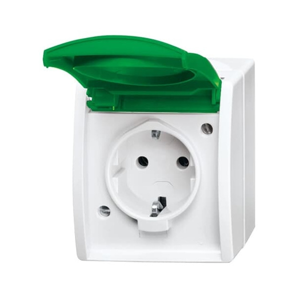 A0837 Zum Anschließen von elektrischen Verbrauchern. Mit grünem Klappdeckel, SV, (RAL 6018). Durchgehende farbige Kennzeichnung (Klappdeckel und Sockel). Designlinie: ocean® Abmessungen Beschriftungsfeld: 57.8 x 9.8 mm