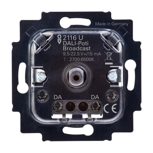 A3025 Für Broadcastbetrieb (Zentral-Telegramm). Zum Schalten und Steuern von bis zu 64 DALI-Betriebsgeräten gemäß IEC 62386 (z.B. EVG und Trafos mit DALI-Schnittstelle) . Mit Drehbetätigung und Druck-AUS-Taster. Verpolungsicher. Zur Änderung der Farbtemperatur von >tunable white< Leuchten/Leuchtmitteln, die dem DALI-Standard IEC 62386-209 (Device Type 8) entsprechen. Farbtemperatur dann zwischen 2.700 K - 6.500 K einstellbar. Einschalthelligkeit und Grundhelligkeit netzausfallsicher einstellbar. Mit LED-Orientierungslicht, 18 Farben einstellbar + AUS. Parallelschaltung von bis zu 5 Geräten im passiven Betrieb. Max. Stromaufnahme: 15 mA. Nicht für die Kombination mit DALI-Sensoren oder Zentralen anderer Hersteller geeignet. Zur Erzeugung der DALI-Spannung wird eine Spannungsversorgung gemäß IEC 62386 benötigt, z.B. von Tridonic, Philips, Helvar oder BJE-Art.-Nr. 2116/11 U. Max. DALI-Leitungslänge: 300 m (bei 1,5 - 2,5 mm²). Montage in UP Dosen nach DIN 49073 erforderlich. Designlinie: Plattform 63, Busch-Duro 2000® SI, Reflex SI, Busch-balance® SI, Busch-art linear®, future® linear, Busch-axcent®, solo®, pur edelstahl, carat®, Busch-dynasty®, alpha, impuls Designlinie Variante: Busch-Duro 2000® SI, Busch-Duro 2000® SI Linear, Reflex SI, Reflex SI Linear, Busch-art linear®, Busch-art linear® - mit Dekorring, Busch-art linear® - Echtmaterial, future®, future® linear, Busch-axcent®, Busch-axcent® pur, alpha nea®, alpha exclusive®