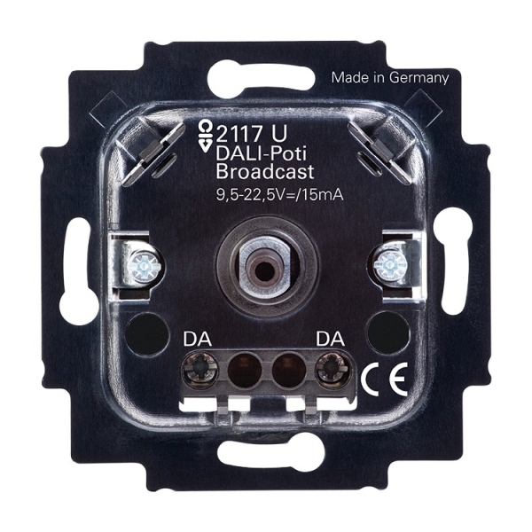 A2985 Für Broadcastbetrieb (Zentral-Telegramm). Zum Schalten und Steuern von bis zu 64 DALI-Betriebsgeräten gemäß IEC 62386 (z.B. EVG und Trafos mit DALI-Schnittstelle) . Mit Drehbetätigung und Druck-AUS-Taster. Verpolungsicher. Einschalthelligkeit und Grundhelligkeit netzausfallsicher einstellbar. Mit LED-Orientierungslicht, 18 Farben + AUS einstellbar. Parallelschaltung von bis zu 5 Geräten im passiven Betrieb. Nicht für die Kombination mit DALI-Sensoren oder Zentralen anderer Hersteller geeignet. Zur Erzeugung der DALI-Spannung wird eine Spannungsversorgung gemäß IEC 62386 benötigt, z.B. von Tridonic, Philips, Helvar oder BJE-Art.-Nr. 2117/11 U. Max. DALI-Leitungslänge: 300 m (bei 1,5 - 2,5 mm²). Montage in UP Dosen nach DIN 49073 erforderlich. Designlinie: Plattform 63, Busch-Duro 2000® SI, Reflex SI, Busch-balance® SI, Busch-art linear®, future® linear, Busch-axcent®, solo®, pur edelstahl, carat®, Busch-dynasty®, alpha, impuls Designlinie Variante: Busch-Duro 2000® SI, Busch-Duro 2000® SI Linear, Reflex SI, Reflex SI Linear, Busch-art linear®, Busch-art linear® - mit Dekorring, Busch-art linear® - Echtmaterial, future®, future® linear, Busch-axcent®, Busch-axcent® pur, alpha nea®, alpha exclusive®