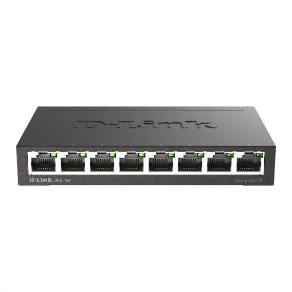 Dieser kompakte Netzwerk Switch bietet acht Plug & Play Anschlüsse an kleine Büros, Arbeitsgruppen und Abteilungsnetzwerke mit 10/100/1000 Mbit/s. Der Gigabit Switch kommt ohne Lüfter aus und ist damit optimal für den Einsatz direkt am Arbeitsplatz geeignet.D-Link DGS 108 - Switch - 8 x 10/100/1000 - Desktop Dieser kompakte Switch bietet acht Plug & Play Anschlüsse an kleine Büros, Arbeitsgruppen und Abteilungsnetzwerke mit 10/100/1000 Mbit/s. Der Gigabit Switch kommt ohne Lüfter aus und ist damit optimal für den Einsatz direkt am Arbeitsplatz geeignet. Der DGS-108 sorgt mit Geschwindigkeiten von bis zu 2000Mbit/s (Full-Duplex) sowie Flow-Control gemäß IEEE 802.3x für schnelle und kontinuierliche Datenübertragungen. Für zeitkritische Anwendungen unterstützt der Desktop-Switch das Protokoll 802.1p (QoS). Ein robustes Metallgehäuse schützt den Switch vor äußerlichen Beschädigungen. Für eine komfortable und sichere Installation, ist der DGS-108 zudem mit einer Wandhalterung sowie einem Steckplatz für ein Kensington-Sicherheitsschloss ausgestattet. Switch mit Umweltbewusstsein: Der DGS-108 ist mit der aktuellen D-Link Green Technologie ausgestattet und arbeitet nach dem Energy Efficient Ethernet-Standard (IEEE 802.3az EEE). Daten werden dabei in kürzester Zeit mit höchster Geschwindigkeit übertragen, die Ports verbrauchen nur während der Übermittlung Strom. Findet keine Datenübertragung statt, fallen die Ports automatisch in einen