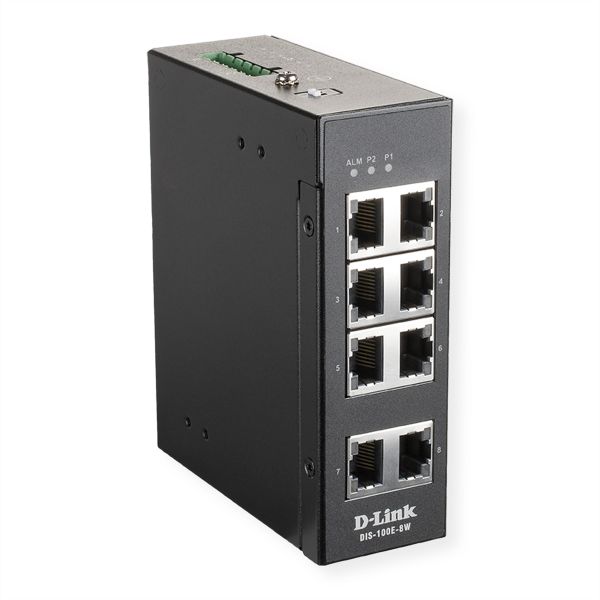 Industrial Fast Ethernet Unmanaged Switch Unmanaged, unkompliziert, Plug-and-Play 8x 10/100Base-T(X)-Ports Hält extremen Temperaturen stand Zertifizierte Vibrations-, Stoß-, Sturzfestigkeit und EMV Widerstandsfähiges Gehäuse Schnelle Einrichtung Kompakte Größe D-Link DIS-100E-8W. Switch-Typ: Unmanaged, Switch-Ebene: L2. Basic Switching RJ-45 Ethernet Ports-Typ: Fast Ethernet (10/100), Anzahl der basisschaltenden RJ-45 Ethernet Ports: 8. Vollduplex. MAC-Adressentabelle: 1000 Eintragungen. Netzstandard: IEEE 802.3x. DC input Spannung: 12 - 58 V. Wandmontage, Rack-Einbau Unmanaged Plug and PlayAnschließen und los. Der DIS-100E-8W leitet zuverlässig Ethernet-Frames weiter.Fast Ethernet VerbindungAusgestattet mit 8x 10/100Base-T(X)-Ports passend zu Ihrem Netzwerklayout.Offiziell zertifiziertZertifizierungen für Vibrations-, Stoß- und Sturzfestigkeit sowie elektromagnetische Verträglichkeit, um maximale Netzwerkverfügbarkeit in einer Vielzahl von Einsatzszenarien zu gewährleisten, darunter Überwachung im öffentlichen Raum, Fabrikautomatisierung und WLAN im Außenbereich.Hält extremen Temperaturen standFunktioniert problemlos in zahlreichen industriellen und anderen anspruchsvollen Umgebungen mit Temperaturen von -40 °C bis +75 °C. Für Kaltstarts ab -40 °C geeignet.Robuste KonstruktionDas robuste Gehäuse wurde entwickelt, damit Ihr Netzwerk zuverlässig geschützt und widerstandsfähig bleibt. Darum gewähren wir auf jeden DIS Switch 5 Jahre D-Link Garantie.Schnelle EinrichtungMit seinem Clip für DIN-Schienen lässt sich der Switch sofort installieren. Auch Wandmontage ist möglich.Lüfterlose AusführungDa im Innern keine beweglichen Teile vorhanden sind, werden Ausfall- und Wartungszeiten reduziert. Das robuste Gehäuse wurde auf Wärmeableitung optimiert