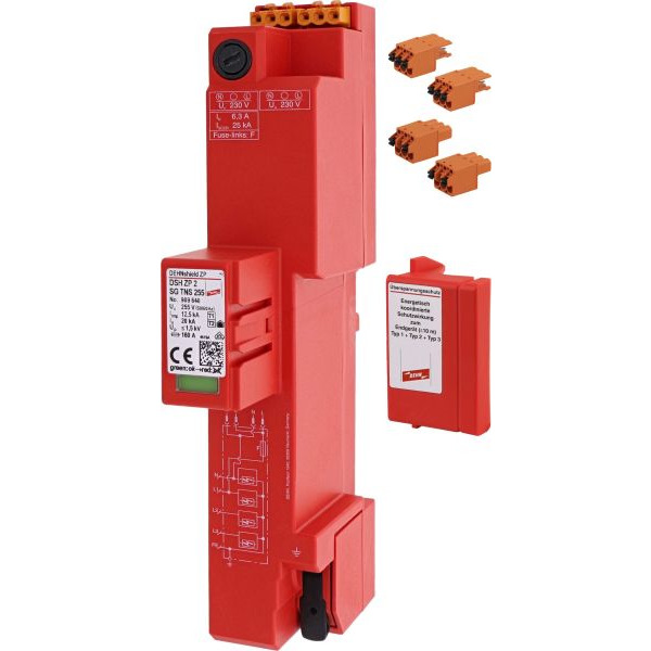 Geprüfter Kombi-Ableiter Typ 1+Typ 2+Typ 3 nach DIN EN 61643-11 für TN-S-Systeme (4+0-Schaltung) inkl. überstromgeschützter 230 V Spannungsversorgung (N und L) inkl. Ersatzsicherung jeweils für RfZ / APZ gem. VDE-AR-N 4100