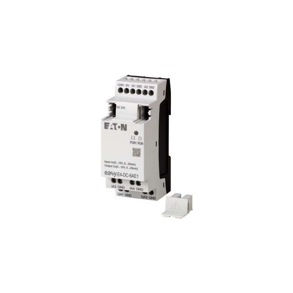 Ein-/Ausgangserweiterung für die Steuerrelais der Serie easyE4 mit einer Bemessungsbetriebsspannung von 24 VDC. Diese Erweiterung stellt zur Verfügung: 4 analoge Eingänge die wahlweise nutzbar sind als Spannungseingänge (0-10V) oder Stromeingänge (0/4-20mA) und 2 analoge Ausgänge die wahlweise nutzbar sind als Spannungsausgänge (0-10 V) oder Stromausgänge (0/4-20 mA). Die Anschlüsse erfolgen per Schraubklemme. Die Verbindung zum Steuerrelais easy-E4 oder einer anderen Erweiterung easy-E4 erfolgt mittels Verbindungsstecker easy-E4-CONNECT1 (Artikel Y7-197225) der im Lieferumfang enthalten ist.
