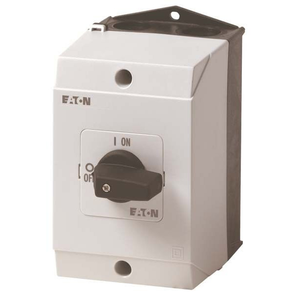 EIN-AUS-Schalter, Sortiment: EIN-AUS-Schalter, Typkenner: T0, mit schwarzem Knebel und Frontschild, 3-polig, Schutzart: IP65, Bauform: Aufbau, Schaltwinkel: 90 °, Schaltverhalten: rastend, Frontschild: 0-1, Bemessungsbetriebsleistung AC-23A, 50 - 60 Hz 400 V: P = 5.5 kW, Bemessungsdauerstrom: Iu = 20 A, 2 Baueinheit(en), Normen und Bestimmungen: IEC/EN 60947, VDE 0660, IEC/EN 60204, Lasttrennschalter nach IEC/EN 60947-3