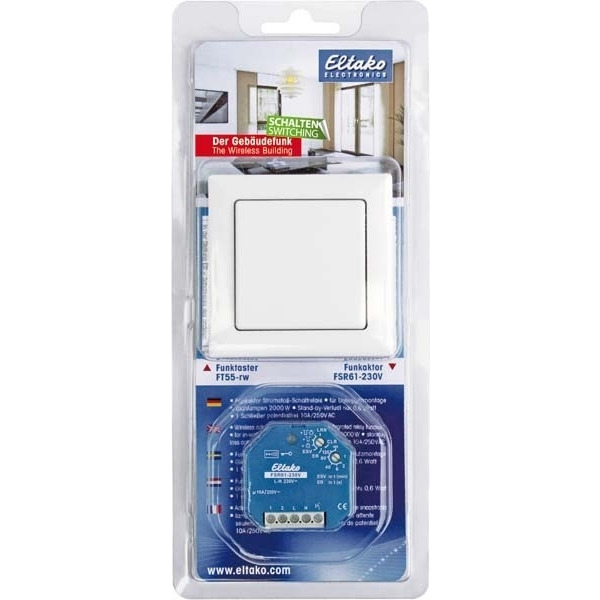Blisterpack Schalten mit Funktaster F2T55E und Funkaktor Stromstoß-Schaltrelais FSR61-230V. Smart Home Sensor und Smart Home Aktor. F2T55E: Funktaster reinweiß glänzend für Einzel-Montage 80x80x15mm oder Montage in das E-Design55-Schaltersystem. Erzeugt die Energie für Funktelegramme selbst bei Tastendruck, daher ohne Anschlussleitung und kein Stand-by-Verlust. Funktaster mit einer Wippe können zwei auswertbare Signale senden: Wippe oben drücken und Wippe unten drücken. Die Halteplatte kann auf eine ebene Fläche geschraubt oder mit der beiliegenden Klebefolie an die Wand, auf Glas oder auf Möbel geklebt werden. Über einer 55mm-Schalterdose werden die in der Dose vorhandenen Hülsen zur Schraubbefestigung verwendet. FSR61-230V: Funktaktor Stromstoß-Schaltrelais 1 Schließer potenzialfrei 10A/250V AC, Glühlampen 2000 Watt, Rückfallverzögerung mit Ausschaltvorwarnung und Taster-Dauerlicht zuschaltbar. Verschlüsselter Funk, bidirektionaler Funk und Repeater-Funktion zuschaltbar. Stand-by-Verlust nur 0,8 Watt. Für Einbaumontage. 45mm lang, 45mm breit, 33mm tief. Versorgungs- und Steuerspannung örtlich 230V. Beim Ausfall der Versorgungsspannung bleibt der Schaltzustand erhalten. Bei wiederkehrender Versorgungsspannung wird definiert ausgeschaltet. Nach der Installation die automatische kurze Synchronisation abwarten, bevor der geschaltete Verbraucher an das Netz gelegt wird. Zusätzlich zum Funk-Steuereingang über eine innenliegende Antenne kann dieser Funkaktor auch mit einem eventuell davor montierten konventionellen Steuertaster örtlich gesteuert werden. Ein Glimmlampenstrom ist nicht zugelassen.