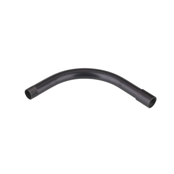 SB-E ist ein Stahlrohr-Gewindebogen aus gewalztem Flussstahl mit Einbrennlackierung, in Farbe schwarz-lackiert, beidseitig mit Gewinde, einseitig aufgeschraubte Muffe (SM-E).