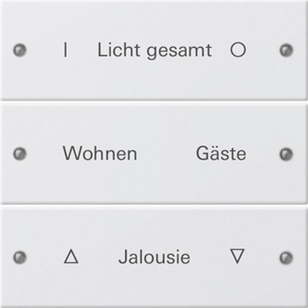 Wippenset 3fach beschreibbar Reinweiß glänzend (lackiert) System 55 Merkmale: Hinweise: Beschreibbare Wippensets und Wippensets mit Beschriftungsfeld können mit einer individuellen Beschriftung versehen werden. Die Bestellung wird über den Großhandel abgewickelt, der beim Bestellvorgang der Wippen angegeben wurde. Beschreibbare Wippensets und Wippensets ohne Beschriftungsfeld sind aus Metall. Dies kann bei Funkanwendungen zu Reichweiteneinbußen führen. Dieses Produkt kann ausschließlich über den Gira Beschriftungsservice bestellt werden. Professionelle Beschriftung über den Gira Beschriftungsservice www.beschriftung.gira.de. Lieferumfang: