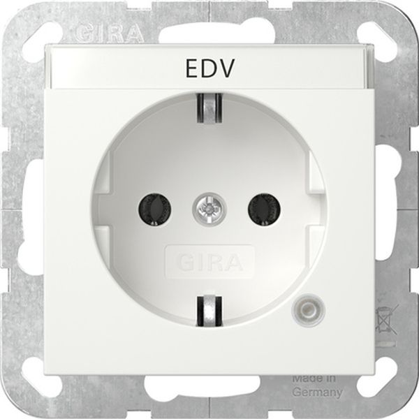 SCHUKO-Steckdose 16 A 250 V~ mit orangem Kontrolllicht und Beschriftungsfeld Reinweiß seidenmatt System 55 Merkmale: Tragring ist in Verbindung mit den Befestigungskrallen und Krallenschrauben geerdet. Schnellbefestigung (ca. 3,5 Umdrehungen pro Befestigungskralle). Eingehauste Spreizkrallen. Einfachere Krallenbefestigung durch robusten Schraubenkopfantrieb PZ1 / Schlitz / PH. Vereinfachte Installation durch patentierte Anordnung der großen Schlüssellochprofile mittels Dosenschrauben. Geringe Einbautiefe. Große, ergonomisch geformte Lösehebel. Stabiler Erdungsbügel mit massiven Erdungsfingern. Stabiler und korrosionsbeständiger Stahltragring. Bruchsicherer Thermoplastsockel. Hinweise: Lieferumfang: Glimmlampenelement ist im Lieferumfang enthalten. Beschriftungsschild EDV ist beigefügt.