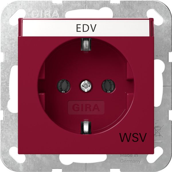 SCHUKO-Steckdose 16 A 250 V~ mit Beschriftungsfeld Rot glänzend mit roter Abdeckung und Aufdruck WSV (weitere Sicherheitsversorgung) Merkmale: Tragring ist in Verbindung mit den Befestigungskrallen und Krallenschrauben geerdet. Schnellbefestigung (ca. 3,5 Umdrehungen pro Befestigungskralle). Eingehauste Spreizkrallen. Einfachere Krallenbefestigung durch robusten Schraubenkopfantrieb PZ1 / Schlitz / PH. Vereinfachte Installation durch patentierte Anordnung der großen Schlüssellochprofile mittels Dosenschrauben. Geringe Einbautiefe. Große, ergonomisch geformte Lösehebel. Stabiler Erdungsbügel mit massiven Erdungsfingern. Stabiler und korrosionsbeständiger Stahltragring. Bruchsicherer Thermoplastsockel. Hinweise: Die Sockel der SCHUKO-Steckdosen sind farblich entsprechend gekennzeichnet. Lieferumfang: Beschriftungsschild EDV ist beigefügt.