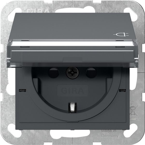 SCHUKO-Steckdose 16 A 250 V~ mit Klappdeckel, Beschriftungsfeld und erhöhtem Berührungsschutz (Safety Plus) Anthrazit System 55 Merkmale: Tragring ist in Verbindung mit den Befestigungskrallen und Krallenschrauben geerdet. Schnellbefestigung (ca. 3,5 Umdrehungen pro Befestigungskralle). Eingehauste Spreizkrallen. Einfachere Krallenbefestigung durch robusten Schraubenkopfantrieb PZ1 / Schlitz / PH. Vereinfachte Installation durch patentierte Anordnung der großen Schlüssellochprofile mittels Dosenschrauben. Geringe Einbautiefe. Große, ergonomisch geformte Lösehebel. Stabiler Erdungsbügel mit massiven Erdungsfingern. Stabiler und korrosionsbeständiger Stahltragring. Bruchsicherer Thermoplastsockel. Hinweise: Erhöhter Berührungsschutz (Safety Plus) gemäß DIN VDE 0620-1. Lieferumfang: Beschriftungsschild EDV ist beigefügt.