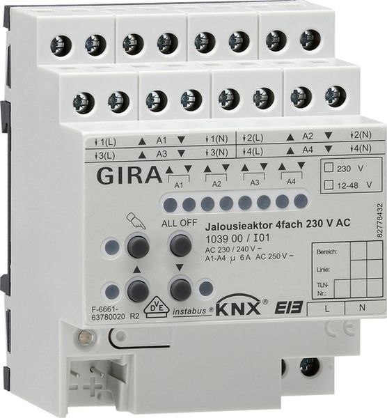 Jalousieaktor 4fach AC 230 V / DC 12 - 48 V mit Handbetätigung für KNX Merkmale: Behangposition direkt ansteuerbar. Lamellenstellung direkt ansteuerbar. Verhalten bei Busspannungsausfall und -wiederkehr einstellbar. Separat parametrierbare Fahrzeiten mit Fahrzeitverlängerung für Fahrten in die obere Endlage. Zentrale Ansteuerung aller Jalousieausgänge möglich. Rückmeldung der Behangposition oder der Lamellenposition. Rückmeldungen lassen sich nach Busspannungswiederkehr verzögern. Zuordnungen auf bis zu fünf verschiedene Sicherheitsfunktionen (drei Windalarme, ein Regenalarm, ein Frostalarm), wahlweise mit zyklischer Überwachung. Zwangsstellungsfunktion für jeden Jalousieausgang realisierbar. Einbeziehung in Szenen möglich, max. acht interne Szenen je Kanal sind parametrierbar. Speicherfunktion für Lichtszenen. Sonnenschutzfunktion mit festen und variablen Behang- oder Lamellenpositionen aktivierbar. Erweiterter Sonnenschutz mit umfangreichen Steuerfunktionen. Einbindung in Temperatur-Management des Gebäudes möglich. Sperren einzelner Ausgänge per Hand oder Bus. Aktive oder passive (Objekt auslesbar) zyklische Rückmeldefunktionen. Baustellenbetrieb: Ausgänge manuell bedienbar ohne Busspannung nur mit der Betriebsspannung. Für Netzspannung AC 230 V (4 kanalig) oder Kleinspannung DC 12 bis 48 V (2-kanalig). Anschluss verschiedener Außenleiter. Unabhängige Ansteuerung der vier Jalousieausgänge. Automatische Behangfahrzeiterkennung bei Antrieben AC 230 V mit mechanischen Endlagenschaltern. Hinweise: Montage auf DIN-Hutschiene. VDE-Zulassung gemäß EN 60669-1, EN 60669-2-1. Lieferumfang: Anschluss- und Abzweigklemme für KNX im Lieferumfang enthalten.
