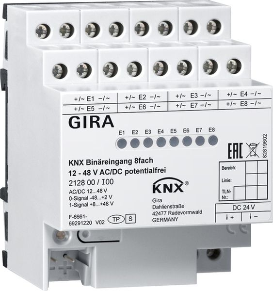 Binäreingang 8fach 12 48 V AC/DC potenzialfrei für KNX Merkmale: Jeder Eingang verfügt über den vollen Funktionsumfang. Alle kanalorientierten Funktionen lassen sich separat für jeden Eingang parametrieren. Aktiv sendende Telegramme der Eingänge lassen sich nach Busspannungswiederkehr oder nach einem ETS-Programmiervorgang global verzögern. Entprellzeit und Telegrammratenbegrenzung konfigurierbar. Freie Zuordnung der Funktionen Schalten, Dimmen, Jalousie, Wertgeber und Impulszähler zu den Eingängen. Sperrobjekt zum Sperren einzelner Eingänge (Polarität des Sperrobjekts einstellbar) für die Funktionen Schalten, Dimmen, Jalousie und Wertgeber. Verhalten bei Busspannungswiederkehr für jeden Eingang separat parametrierbar. Funktion Schalten: zwei unabhängige Schaltobjekte für jeden Eingang vorhanden (Schaltbefehle sind einzeln parametrierbar), Befehl bei steigender und fallender Flanke unabhängig einstellbar (EIN, AUS, UM, keine Reaktion), unabhängiges zyklisches Senden der Schaltobjekte in Abhängigkeit der Flanke oder in Abhängigkeit des Objektwerts wählbar. Funktion Dimmen: Einflächen- und Zweiflächen-Bedienung, Zeit zwischen Dimmen und Schalten und Dimmschrittweite einstellbar, Telegrammwiederholung und Stopptelegramm senden möglich. Funktion Jalousie: Befehl bei steigender Flanke einstellbar (keine Funktion, AUF, AB, UM), Bedienkonzept parametrierbar (Step - Move - Step oder Move - Step), Zeit zwischen Kurz- und Langzeitbetrieb einstellbar (nur bei Step - Move - Step), Lamellenverstellzeit einstellbar. Funktion Wertgeber: Flanke (Taster als Schließer, Taster als Öffner, Schalter) und Wert bei Flanke parametrierbar, Wertverstellung bei Taster über langen Tastendruck für Wertgeber möglich, Lichtszenennebenstelle mit Speicherfunktion auch Speicherung der Szene ohne vorherigen Abruf möglich. Funktion Impulszähler: Zählintervall einstellbar, Flanke (Zählen bei steigender Flanke, Zählen bei fallender Flanke, Zählen bei steigender und fallender Flanke) parametrierbar, Anzahl der erforderlichen Impulse am Eingang parametrierbar, Anzahl der erforderlichen Zählimpulse für eine Zähleränderung parametrierbar, Jeder Eingang beinhaltet einen Hauptzähler und einen Zwischenzähler, Hauptzähler und Zwischenzähler können getrennt voneinander als Vorwärts- oder Rückwärtszähler arbeiten, Start- und Endwerte der Zähler können über Parameter oder Kommunikationsobjekt vorgegeben werden, Abfrage Zählerstand über KNX oder automatisch, Verhalten nach Ablauf des Zählers ist parametrierbar, Impulszähler über KNX zurücksetzten (Zähler-Reset). Der Binäreingang hat acht voneinander unabhängige Eingänge an die elektrische Signale im Spannungsbereich von 12 bis 48 V angeschlossen werden. Auswertung von Gleichspannungssignale (DC) oder Wechselspannungssignale (AC). Der Binäreingang stellt eine separate DC 24 V Hilfsspannung (SELV) für den Anschluss potenzialfreier Kontakte zur Verfügung. Statusmeldung bei Fehler mit der Hilfsspannung auf den Bus absetzbar. Anschluss von Zählern mit S0-Schnittstelle möglich (z. B. Energie-, Gas-, Wasserzähler). Hinweise: Lieferumfang: Anschluss- und Abzweigklemme für KNX im Lieferumfang enthalten.