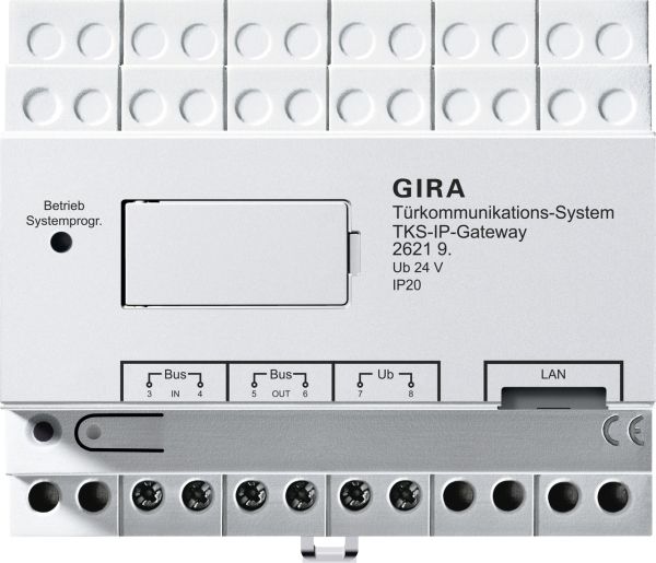 TKS-IP-Gateway Merkmale: TKS mobil Einbindung mobiler Endgeräte mit Android- oder iOs-Betriebssystem ins Gira Türkommunikationssystem. Gira TKS mobil App zu finden im App Store für iOS und Android. Beim Zugriff von unterwegs wird die Kommunikation über das integrierte Secure-Data-Access-Protokoll verschlüsselt, welches auch beim Gira S1 zum Einsatz kommt. TKS-Communicator Mit der Software TKS-Communicator können handelsübliche Computer sowie PC-basierte Bediengeräte über die Netzwerkanbindung als Wohnungsstation genutzt werden. Der TKS-Communicator bietet alle Funktionen einer Wohnungsstation Video, wie z. B. Gespräche annehmen, Licht schalten (in Verbindung mit einem Schaltaktor) oder Tür öffnen. Die Verbindung zum Gira HomeServer bzw. Gira FacilityServer über ein Plug-in ermöglicht die Darstellung im Gira Interface. Über Logikbausteine ist die Realisierung neuer Anwendungsmöglichkeiten, wie z. B. Zutrittskontrolle über die Gira Keyless In Produkte, möglich. Inbetriebnahme Der Inbetriebnahme-Computer muss über einen aktuellen Browser (z. B. Mozilla Firefox, Microsoft Edge, Opera, Safari, Chrome) verfügen. Hinweise: Folgende Lizenzmodelle stehen zur Verfügung: - 2621 97: 5 gleichzeitig aktive TKS-Communicator - 2621 98: 10 gleichzeitig aktive TKS-Communicator - 2621 99: 20 gleichzeitig aktive TKS-Communicator Bei den Lizenzmodellen ist zu beachten, dass der TKS-Communicator auf beliebig vielen Endgeräten installiert werden darf. Die im Lizenzmodell angegebene Zahl gibt lediglich die Anzahl der gleichzeitig angemeldeten TKS-Communicatoren an. Zur Spannungsversorgung des TKS-IP-Gateways wird zusätzlich die Spannungsversorgung für Türkommunikation benötigt. Die Inbetriebnahme des TKS-IP-Gateways erfolgt per Web-Interface. Für die Inbetriebnahme über das Web-Interface muss der Inbetriebnahme-Computer über einen aktuellen Browser (z. B. Mozilla Firefox, Microsoft Internet Explorer, Opera, Safari, Chrome) verfügen. Einbindung handelsüblicher externer IP-Kameras im H.264 Standard (alle Profile). Lieferumfang: