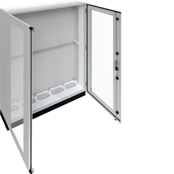 Schrank, univers, IP55/I, 1850x1300x275mm + 100mm Sockel, Klarsichttür.Einzelstandverteiler für die Innenraummontage mit VDE-Gutachten (Fertigungsüberwachung) nach DIN EN 61439-1/-2/-3 und Maßnorm DIN 43 870, zur Aufputz Montage. Zum Aufbau einer Niederspannungsverteilung bis 800 A, 3AC 230/400 V 50 Hz. Schutzart IP55, Schutzklasse I oder II, Luft- und Kriechstrecken nach DIN VDE 0110-1/-2. Bestehend aus Schrank mit Tür aus pulverbeschichtetem, eingebranntem, profiliertem 1,5 mm dicken Stahlblech. Durchsteckflansche oben, unten offen (Leitungseinfügungen einbaubar). Sammelschienendurchführungen als seitliche Vorprägung. Tür aufliegend, mit innen liegenden Scharnieren, Türanschlag standardmäßig rechts, wechselbar, mit 110 Grad Öffnungswinkel. Serienmässig mit Schwenkhebelverschluss, DIN-Profil-Halbzylinder einbaubar. Waagerechte Abfangschiene zur stabilisierung im Schrank enthalten. Türdichtung umlaufend geschäumt, temperaturbeständig und ölbeständig. Sockelleiste (Höhe 100 mm) serienmäßig montiert mit abnehmbarer Frontblende.Hinweis: Wand- und Bodenbefestigung notwendig! Türverschluß durch andere Schließungen austauschbar. Schrank nebeneinander anflanschbar.