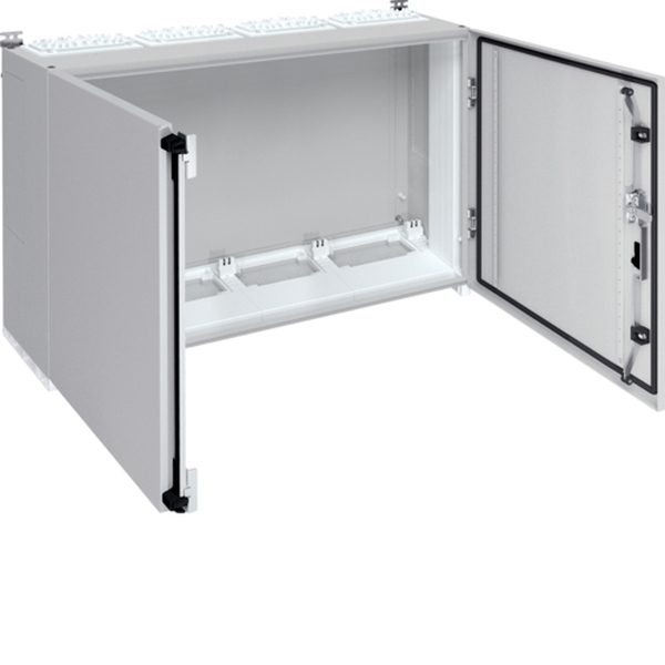Schrank, univers, IP55/I, 800x1050x275mm.Wandaufbauschrank für die Innenraummontage mit VDE-Gutachten (Fertigungsüberwachung) nach DIN EN 61439-1/-2/-3 und Maßnorm DIN 43870, zur Aufputz Montage. Zum Aufbau einer Niederspannungsverteilung bis 800 A, 3AC, 690 V 50 Hz. Schutzart IP55, Schutzklasse I, Luft- und Kriechstrecken nach DIN VDE 0110-1/-2. Bestehend aus Schrank mit Tür aus pulverbeschichtetem, eingebranntem, profiliertem 1,5 mm dicken Stahlblech. Durchsteckflansche oben, unten ISO-Flanschplatten mit metrischen Vorprägungen und Schnellverriegelung je Feld eingebaut. Sammelschienendurchführungen als seitliche Vorprägung. Tür aufliegend, mit innenliegenden Scharnieren, Türanschlag standardmäßig rechts, wechselbar, 110 Grad Öffnungswinkel. Serienmässig mit Schwenkhebelverschluss, DIN-Profil-Halbzylinder einbaubar. Türdichtung umlaufend geschäumt, temperaturbeständig und ölbeständig. Schrank nebeneinander und übereinander anflanschbar.