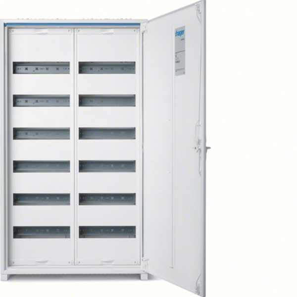 Feldvert. AP, univers, IP44, SKII, 144PLE, 2x6 Reihen, 950x550x161mm, o.Klemme.Feldverteiler nach DIN EN 61 439-1/-3, Maßnorm nach DIN 43 870. Zum Einbau für Geräte bis 125 A, Luft- und Kriechstrecken nach DIN EN 60664-1. Bestehend aus Schrank mit Tür aus pulverbeschichtetem und eingebranntem Stahlblech. Ab Schrankbreite 800 mm (3-feldig) zwei türiger Aufbau. Rechte Türen maximal 2-feldig breit. Komplettschrank mit Einbausatz bestückt mit profilierten Tragschienen, 7,5 mm hohen Hutschienen in 125 mm Mittenabstand und passenden Berührungsschutzabdeckungen, ohne PE/N-QuickConnect-Klemmen und ohne Träger. Leitungseinführungen oben/unten durch herausnehmbare flexiblen Kunststoffflanschplatten, zusätzlich austauschbar. Tür mit innenliegenden justierbaren Scharnieren und einem Öffnungswinkel von 110°. Türen rechts und links anschlagbar, werkzeugloser wechselbar Türanschlag. Türverschluss serienmäßig mit Dreipunkt-Stangenverschluss und plombierbaren Klappgriff. Austauschbare sperrbare Schließsysteme und Türen, siehe Zubehör.