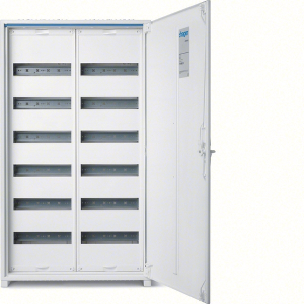 Feldvert. AP, univers, IP44, SKII, 144PLE, H:950xB:550xT:161mm, QuickConnect.Feldverteiler nach DIN EN 61 439-1/-3, Maßnorm nach DIN 43 870. Zum Einbau für Geräte bis 125 A, Luft- und Kriechstrecken nach DIN EN 60664-1. Bestehend aus Schrank mit Tür aus pulverbeschichtetem und eingebranntem Stahlblech. Ab Schrankbreite 800 mm (3-feldig) zwei türiger Aufbau. Rechte Türen maximal 2-feldig breit. Komplettschrank mit Einbausatz bestückt mit profilierten Tragschienen, 7,5 mm hohen Hutschienen in 125 mm Mittenabstand und passenden Berührungsschutzabdeckungen, inklusiv PE/N-QuickConnect-Klemmen auf Träger montiert. Leitungseinführungen oben/unten durch herausnehmbare flexiblen Kunststoffflanschplatten, zusätzlich austauschbar. Tür mit innenliegenden justierbaren Scharnieren und einem Öffnungswinkel von 110°. Türen rechts und links anschlagbar, werkzeugloser wechselbar Türanschlag. Türverschluss serienmäßig mit Dreipunkt-Stangenverschluss und plombierbaren Klappgriff. Austauschbare sperrbare Schließsysteme und Türen, siehe Zubehör.