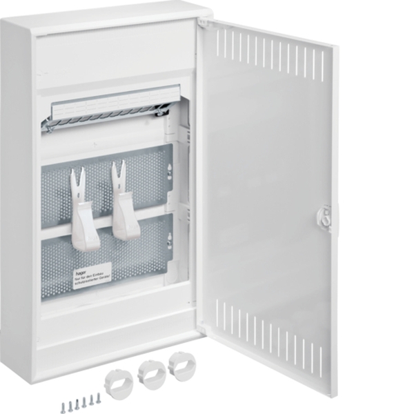 Multimedia, volta, APV, 3-reihig, mit geschlitzter Stahlblechtür.Installationskleinverteiler Aufputz aus Kunststoff, nach DIN VDE 61439-3, geeignet zum Einsatz in Wohngebäuden nach DIN 18015 und zum Einbau von schutzisolierten VDI Komponenten. Schutzart IP30, Schutzklasse II schutzisoliert.Bestehend aus: Kunststoffbodenplatte mit serienmäßigem Leitungsabfang, Lüftungstür aus Stahlblech pulverbeschichtet und eingebrannt, frontbündig mit innenliegenden handbedienbaren Scharnieren. Türverschluss mit frontbündiger Griffmulde und selbsttätig zurückklappendem Griff, Türanschlag rechts oder links.Oberer Anschlussraum: Patch Panel und DIN-Hutschiene isoliert aufgerastet zur Aufnahme von unterschiedlichen Kommunikationsmodulen, für den geforderten Funktionspotentialausgleich nach DIN EN 50310 (VDE 0800-2-310) sind am Patch Panel 2 Schraubbefestigungen vorhanden. Beschriftungsmöglichkeit mit beiliegendem Bezeichnungsstreifen zur Portbeschriftung. Vormontierte gelochte Montageplatten aus verzinktem Stahlblech mit 3,2 mm Lochung sind eingebaut. Ein Universalhaltebügel kann für die schraublose Befestigung von VDI-Komponenten direkt auf dem Lochblech eingehängt werden.Im unteren Anschlussraum ist eine 3-fach Schutzkontaktsteckdosen (90° drehbar) montiert. Über eine Anschlussklemme sind die Steckdosen direkt anschließbar. Die Steckdosen sind mit einer beiliegenden Schutzkontaktabdeckung zur Einhaltung der Schutzklasse II bestückbar. Die 3-fach Schutzkontaktsteckdose ist zusätzlich in zwei Positionen auf einer DIN-Hutschiene montierbar.Hinweis: Ein Überspannungsschutzmodul Typ 3 kann direkt angeschlossen werden (nicht enthalten).