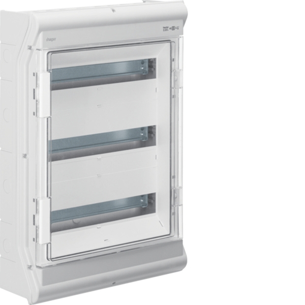 Kleinverteiler, vector, APV, IP65, 54PLE, UV-stabil, m. metr. Leitungseinführung.Installationskleinverteiler aus Polycarbonat (UV-beständig), nach DIN EN 60670-24, nach DIN 43871. Zum Einbau von Geräten bis 63 A nach Maßnorm DIN 43 880 mit 70 mm oder 85 mm Einbautiefe, Bemessungsspannung AC 400 V/50 Hz. Bestehend aus Kunststoffunterteil mit Hutprofilschiene aus verzinktem Stahlblech, Vorprägung für metrische Leitungseinführungstüllen (oben, unten), seitliche Vorprägungen für Verbindungstüllen zur Verbindung von zwei oder mehreren Verteilern nebeneinander. Oberteil mit 46 mm Geräteschlitz. Klarsichttür frontbündig, rechts oder links anschlagbar, plombierbar, abschließbar, Verteiler anflanschbar.