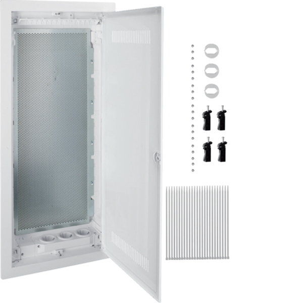 Multimediaverteiler für Homeway, Hohlwand, 4-reihig, geschlitzte Kunststofftür.Installationskleinverteiler Hohlwand aus Kunststoff, nach DIN VDE 61439-3, geeignet zum Einsatz in Wohngebäuden nach DIN 18015 und zum Einbau von schutzisolierten VDI Komponenten. Schutzart IP30, Schutzklasse II schutzisoliert.Bestehend aus Kunststoff-Mauerkasten mit serienmäßigem Leitungsabfang und ausbrechbaren Leitungseinführungsschieber mit Schnappbefestigung sowie integrierter Wasserwaage, inkl. verzinkten Stahlblech-Befestigungslaschen. Verdrehbarer Blendrahmen mit Lüftungstür aus Stahlblech mit geschlitztem Kunststoffeinsatz für ein besseres WLAN-Signal, pulverbeschichtet und eingebrannt, mit 15 mm Putzausgleich. Lüftungstür, frontbündig mit innenliegenden handbedienbaren Scharnieren. Türverschluss mit frontbündiger Griffmulde und selbsttätig zurückklappendem Griff. Türanschlag rechts oder links ohne Blendrahmen-Demontage.Durchgängig gelochte Montageplatte aus verzinktem Stahlblech mit 3,2 mm Lochung zur Befestigung von aktiver und passiver Kommunikationstechnik. Die im Mauerkastenschieber integrierte Spannungsversorgung, ist mit drei, um 90° drehbaren Schutzkontaktsteckdosen bestückt. Über eine Anschlussklemme sind die Steckdosen direkt anschließbar. Die Steckdosen sind mit einer beiliegenden Schutzkontaktabdeckung zur Einhaltung der Schutzklasse II bestückbar.Hinweis: Optimiert für die Verwendung als zentraler Kommunikationsverteiler für das homeway Heimverkabelungssystem.