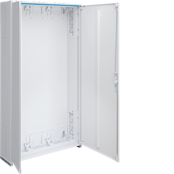 Zählerschrank, univers Z, 1400x800x205 mm, Schutzklasse II, 324 Platzeinheiten.Schrankgehäuse nach DIN VDE 0603-1, Maßnorm DIN 43870 zur Aufputz, Unterputz oder teilversenkter Montage. Zum Aufbau einer Zählerverteileranlage bis 355 A, Bemessungsspannung 230/400 V 50 Hz. Schutzart IP31 (IP44/IP54 nach DIN VDE 0470-1), Schutzklasse II schutzisoliert, Schutzart IP3X hinter der Tür. Bestehend aus Schrank mit Tür aus pulverbeschichtetem, eingebranntem, stabil profiliertem 1 mm dickem Stahlblech. Innenauskleidung komplett aus Kunststoff. Leitungseinführungen oben und unten durch eingebaute Kunststoffflanschplatten, rückseitige Vorprägung im Kunststoffteil und seitlich eingebaute Kunststoff-Flanschplatten im Bereich des NAR (geeignet als Sammelschienendurchführung), des RfZ (nur bei Bauhöhe 1100 mm) und des AAR.Tür frontbündig mit innenliegenden, justierbaren Scharnieren, wahlweise rechts oder links anschlagbar mit 110° Öffnungswinkel. Türverschluss mit Vorreiber, ab Breite 800 mm und bei allen Schränken ab einer Höhe von 1250 mm mit Stangenverschluss mit Dreipunktschließung. Türverschluss durch andere Schließungen austauschbar. Schrank nebeneinander und übereinander anflanschbar. Schrankgröße 1- bis 5-feldrig mit 72 bis 540 Platzeinheiten (PLE).Hinweis: Bei einer Schrank-Schrank-Verbindung immer einen Verbindungssatz verwenden (Zubehör). Im AAR-Bereich kann die Kunststoff-Flanschplatten entfernt werden und optional eine SCHUKO-Steckdose oder eine CEE-Steckdose eingebaut werden.