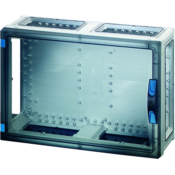 Gehäuse mit Tür für den Bau von Installationsverteilern bis 250 A für die Bedienung durch Laien nach IEC 61439-3. Offene Gehäusewände für die Kombination oder als Einzelgehäuse mit Verschlussplatten. Aus hochwertigem Polycarbonat, schutzisoliert. Schnelle Gehäuseverbindung durch Steckverbinder und integrierte Dichtungen. Große Wanddurchführungen für die elektrische Verbindung der Gehäuse untereinander. Kabeleinführung über Flansche. Wandbefestigung direkt am Gehäuse, über Außenlaschen oder mit Montageschienen. Leergehäuse mit transparenter Tür und plombierbarem Türverschluss mit Handbetätigung. Für den Einbau von Geräten auf Montageplatte oder DIN-Tragschiene, Einbaumaße B 486 x H 306 x T 140 mm. Max. Einbautiefe bei eingebauter Montageplatte 136 mm, bei eingebauter Tragschiene 125 mm.