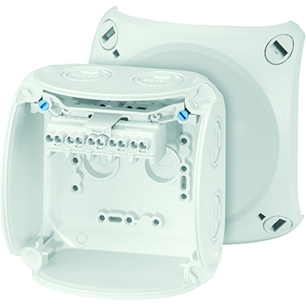 Kabelabzweigkasten aus hochwertigem Thermoplast für die ungeschützte Installation im Freien oder Aufputz-Anwendungen in Gebäuden. Beständig gegen Witterungseinflüsse wie UV-Belastung durch Sonneneinstrahlung, geschützt gegen Regenwasser, temperaturbeständig und schlagfest. Deckelbefestigung über Schnellverschlüsse. Mit Außenlaschen zur Befestigung. Seewasserbeständig, für Offshore-Anwendungen. Mit Zulassung für die Installation auf Schiffen. Klemme mit 2 Klemmstellen je Pol bis 2,5 mm², 5-polig. Kabeleinführung über metrische Vorprägungen. Anbau-Kabelstutzen im Zubehör. Mit Deckelhalteband.