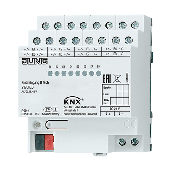 REG-Gehäuse 4 TE 8 Eingänge 12 ... 48 V AC/DC Hilfsspannungsausgang DC 24 V (SELV) zur Abfrage potentialfreier Kontakte mit Statusanzeige ETS-Produktfamilie Eingabe Produkttyp Binäreingang 8fach Bestimmungsgemäßer Gebrauch Abfrage konventioneller Schalt- oder Tastkontakte, Fensterkontakte etc. in KNX-Anlagen zum Melden von Zuständen, Zählerständen, Bedienen von Verbrauchern etc. Montage auf Hutschiene nach DIN EN 60715 in Unterverteiler Produkteigenschaften Status-LED für jeden Eingang Erkennen von Spannungspegeln und -wechseln am Eingang Senden des Eingangszustandes auf den Bus Sendeverhalten frei einstellbar Funktionen: Schalten, Dimmen, Jalousien auf/ab, Helligkeitswerte, Temperaturen, Abrufen und Abspeichern von Szenen Eingänge separat sperrbar Anschluss externer Wechsel- und Gleichspannungen möglich