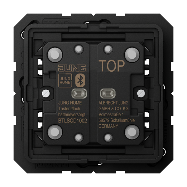 inklusive Montageplatte, Klebefolie und Befestigungsschrauben für Wippen Art.-Nrn. .. 102 KO5 .. in den Serien CD und LS Bestimmungsgemäßer Gebrauch Bedienen von z. B. Jalousien, Rollläden, Markisen, Beleuchtung oder Lüftern Drahtlose Verknüpfung mit Geräten des JUNG HOME Systems Montage auf Gerätedose mit Abmessungen nach DIN 49073 Schraubbefestigung auf Wänden oder Klebemontage auf glatten Flächen Produkteigenschaften Inbetriebnahme und Bedienung über JUNG HOME App mit mobilem Endgerät (Smartphone oder Tablet) über Bluetooth® Mehrfarbige Statusanzeige Zentralfunktionen Alles EIN, Alles AUS und Szenen aufrufen Sperren der lokalen Bedienung Voll verschlüsselte drahtlose Kommunikation Kompatibel zum Bluetooth® Mesh Standard Updatefähig über JUNG HOME App Batteriebetrieb mit einer Lithium-Knopfzelle, gehört zum Lieferumfang