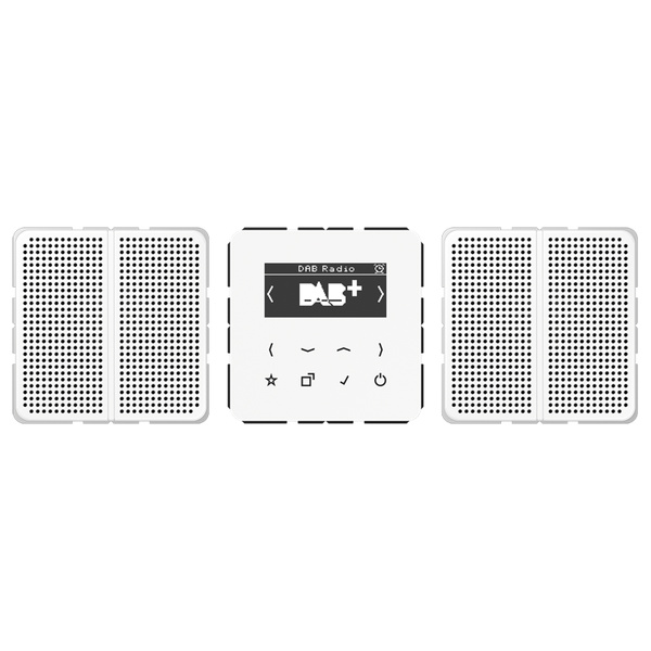 Bestimmungsgemäßer Gebrauch DAB-Empfang im Frequenzbereich 174 MHz bis 240 MHz (VHF-Band III und Kanal 13) UKW-Empfang im Frequenzbereich 87,5 MHz bis 108 MHz (VHF-Band II) Montage auf Gerätedose mit Abmessungen nach DIN 49073 Tiefe der Gerätedose (Innenmaß): min. 40 mm Produkteigenschaften Digitalradio mit Display und Sensortasten Echtglasfront Stereoempfang Anschlussklemmen für zwei Lautsprecher Stereo-/Monoumschaltung Einfache Bedienung Integrierte Antenne für DAB+ und UKW Hohe Empfangsqualität Automatischer Sendersuchlauf Speicherung von 8 Favoriten DAB+ und 8 Favoriten UKW (bleiben nach Spannungsausfall erhalten) Einschalten mit letztem Sender Einschalten mit letzter Lautstärke Einschalten mit letzter Betriebsart (DAB+ oder UKW) Anzeige von Senderinformationen, Uhrzeit und aktuellen Einstellungen Aktualisierung der Uhrzeit über RDS und DAB+ Display-Helligkeit einstellbar Nachtmodus Weckfunktion Sleep-Modus Ein-/Ausschalten über Nebenstelle Line-Out-Ausgang (AUX) zum Anschluss an externe Verstärker Optionale externe Wurfantenne Art.-Nr.: RAD-ANT Nebenstellenfunktion Über den Nebenstelleneingang kann das Radio gemeinsam mit der Beleuchtung geschaltet werden.