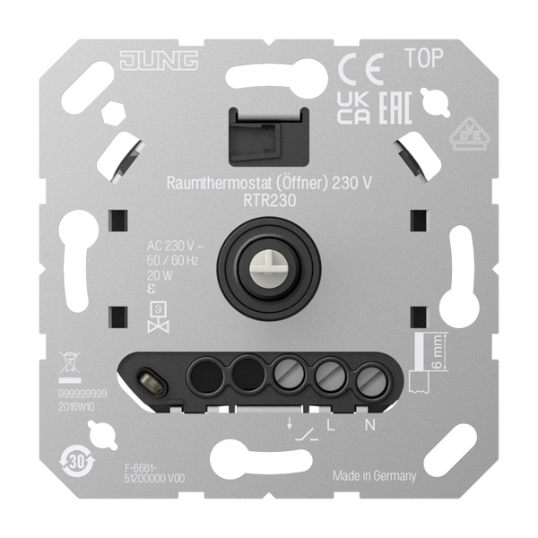 Raumthermostat (Öffner) 230 V Bestimmungsgemäßer Gebrauch Elektronischer Raumtemperaturregler zum Steuern von elektrothermischen Stellantrieben für 230 V ~ (z.B. Art.-Nr. TSA 230 NC WW) Regeln der Raumtemperatur in geschlossenen Räumen Montage in Gerätedose mit Abmessungen nach DIN 49073 Produkteigenschaften Manuelles Einstellen einer Komforttemperatur Temperaturbegrenzungen einstellbar Interner Temperatursensor Geräuschloses Schalten Arbeitsweise Reglerausgang: Pulsweitenmodulation (PWM) Arbeitet mit Ventiltyp stromlos geschlossen Ventilschutzfunktion (1 x wöchentliches Auf- und Zufahren des Ventils) für Abdeckungen Art.-Nrn.: .. 1749 ..
