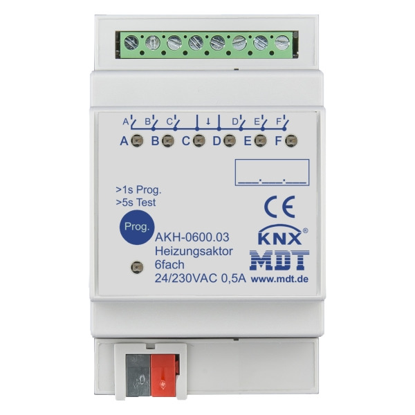 3 KNX Heizungsaktor 6-fach, 3TE REG, 24-230 V AC. Heizungsaktor zur Steuerung von elektrothermischen Stellantrieben, mit LED Anzeige je Kanal. Neue Generation mit Funktionserweiterung. Jeder Kanal kann bis zu 4 Stellantriebe (230 V AC) steuern. Freie Zuordnung der Ausgänge zum Regler-Kanal. Ansteuerung mit 1 Bit (Schalten/PWM) / 1 Byte (stetig) Stellgrößen oder direkte Ansteuerung mit Temperaturwert über KNX-Bus. Integrierter PI Temperaturregler (Heizen und Kühlen). Komfort-, Nacht-, Frostschutzbetrieb. Sommer-/Winterbetrieb. Sollwertverstellung mit 1 Bit +/-, 1 Byte oder 2 Byte Absolutobjekt. Unabhängige Sollwertvorgabe für Komfort, Standby und Nacht. Speicherung der Sollwerte bei Busspannungsausfall. Notbetrieb bei Ausfall der Stellgröße. Überlastschutz mit Störmeldeobjekt (230 V AC). Störmeldung via Objekt bei Ausfall der 230 V Versorgungsspannung. Objekte für Heizungsanforderung sowie Festsitzschutz. Umfangreiche Szenenfunktionen. Kompatibel zu vielen Visualisierungen. Mindestvorlauftemperatur. Klartextdiagnose je Kanal mit 14 Byte Objekt. Schneller Download der Applikation (long frame support ab ETS 5). 3 Jahre Produktgarantie.