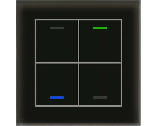 01S KNX Glastaster II Light 4-fach, RGBW, Schwarz, Neutral. Ausführung Neutral mit 4 Sensorflächen. Mit schwarzem Gehäuserückteil. Umfangreiche Applikation. Die Tasten sind als Tastenpaar oder Einzeltasten frei einstellbar. Ein- und Zweitasterbetrieb für Schalten, Dimmen, Jalousie, Werte. Umschalten von bis zu vier Werten oder Szenen. Kurzer/Langer Tastendruck mit 2 Objekten. Mehrfach-Tippfunktion sendet bis zu 4 Werte auf gleiche oder verschiedene Objekte. Innovative Gruppensteuerung mit langem/extra langem Tastendruck. Patschfunktion mit zusätzlichem Schaltobjekt. Vier RGBW Status-LEDs. LED Helligkeit über Tag/Nacht- oder Helligkeit-Objekt steuerbar. 4 Logikblöcke. Einbau in Schalterdose mit mitgeliefertem Tragring. Abmessungen (H x B): 92 x 92 mm. Integrierter Busankoppler. 3 Jahre Produktgarantie.