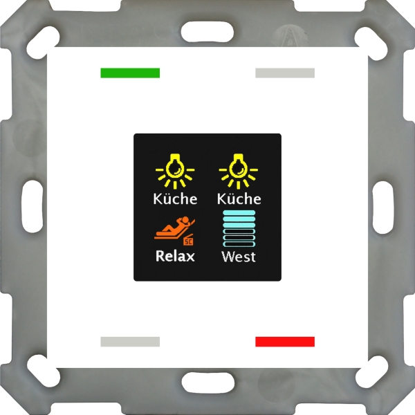 .01 KNX Taster Smart 55 4-fach mit Farbdisplay und T-/F-Sensor, Reinweiß glänzend. Ausführung mit 4 Tasterflächen und Temperatur-/Feuchtesensor. Passend für 55 mm Schalterprogramme z. B. MDT Sortiment 55 oder GIRA Standard 55, E2, Event, Esprit oder BERKER S1, B3, B7 oder JUNG A 500, A PLUS, A CREATION, AS 500, A 550, A FLOW oder MERTEN 1M, M-Smart, M-Plan, M-Pure. Aktives Farbdisplay zur Funktions- und Statusanzeige. Hintergrundfarbe und Helligkeit des Displays einstellbar (weiß oder schwarz). Displayhelligkeit über Helligkeits- und Tag/Nacht-Objekt einstellbar. Anzeige von Innen-/Außentemperatur und Uhrzeit. Mehrfach-Tippfunktion sendet bis zu 4 Werte auf gleiche oder verschiedene Objekte. Innovative Gruppensteuerung mit langem/extra langem Tastendruck. Ein- und Zweitasterbetrieb für Schalten, Dimmen, Jalousie, Werte. Einstellbare Symbole und Texte für jede Taste/Funktion. Kurzer/Langer Tastendruck mit 2 Objekten. Temperatursensor zur Erfassung der Raumtemperatur. Zusätzliche Funktion zur Einstellung von Temperatur und Betriebsart. Keine zusätzliche Spannungsversorgung erforderlich. Einbau in Schalterdose mit mitgeliefertem Tragring. Empfohlene Montagehöhe: 1,05 ... 1,20 m. Integrierter Busankoppler. 3 Jahre Produktgarantie.