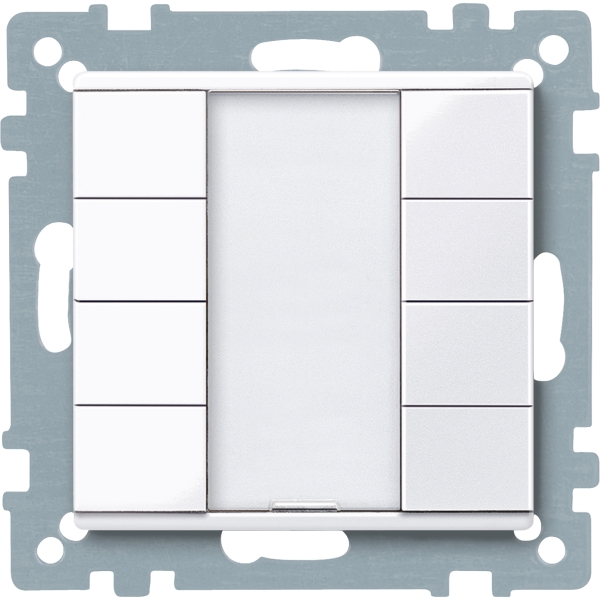 Im Design System M. Mit integriertem Busankoppler. Taster mit 8 Bedientasten, Betriebs-, Statusanzeige und Schriftfeld. Die Betriebsanzeige kann auch als Orientierungslicht verwendet werden. Das Gerät wird über eine Busanschlussklemme mit der Busleitung verbunden. Softwarefunktionen KNX Schalten, Umschalten, Dimmen (ein-/zweiflächig), Jalousie (ein-/zweiflächig). Flanken löst 1,- 2-, 4- oder 8-Bit-Telegramme aus (Unterscheidung kurze/lange Betätigung). Flanken mit 2-Byte-Telegrammen (Unterscheidung kurze/lange Betätigung), 8-Bit-Schieberegler, Szenenabruf, Szenenspeicherung, Sperrfunktionen. Zubehör Beschriftungsbogen für Taster 6183xx Lieferumfang Mit Putzschutzhaube. Mit Busanschlussklemme. Material Thermoplast brillant, antibakteriell. Glatte und selbstdesinfizierende Oberfläche mit antibakterieller Wirkung. Farbe ähnlich RAL 9016. Farbe aktivweiß glänzend.