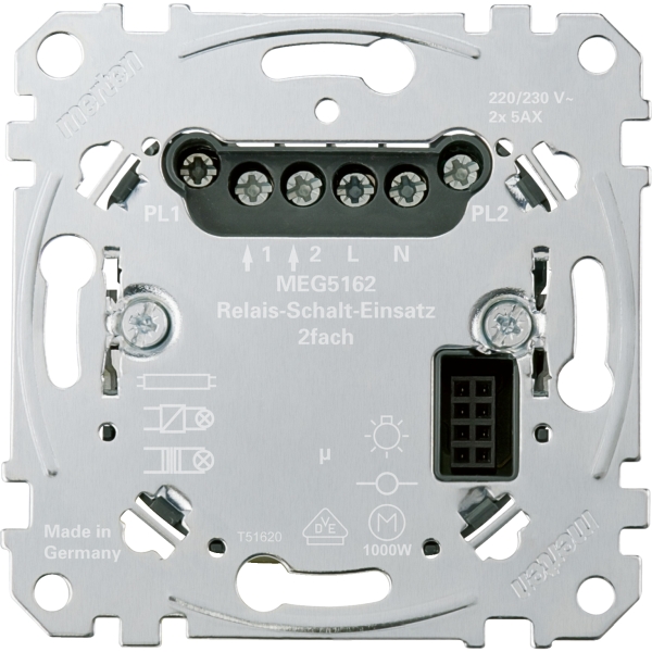 00 Für ohmsche, induktive und kapazitive Lasten wie Glühlampen, Energiesparlampen, NV-Halogenbeleuchtung mit konventionellem Trafo, elektronische Trafos, Leuchtstofflampen. Mit Krallen- und Schraubbefestigung. Mit Schraubklemmen. Funktionen: -Schalten von zwei Ausgängen. Es wird durch das Modul die Art und Weise festgelegt, wie die Funktion des Einsatzes genutzt wird. Externe Ansteuerung über zwei PlusLink Eingängexx Nennspannung: AC 220/230 V, 50/60 Hz. Nennstrom: max. 10 AX, cos Phi 0,6. Die Gesamtbelastung beider Kanäle darf 14 A nicht überschreiten. Ausgänge: 2xSchließer. Max. Schaltleistung pro Kanal: Glühlampen: 2200 W. HV-Halogenlampen: 2000 W. NV-Halogenlampen mit gewickeltem Trafo: 500 VA. Elektronische Trafos: 1050 W. Kapazitive Last: 10 A, 140 uF. Energiesparlampen: 100 VA. Motorlast: 1000 VA. Neutralleiter: erforderlich (3 Leitersystem). Anschlussquerschnitt: max. 2x2,5 mm². Zu komplettieren mit: Taster-Modul Basic, 1fach System M MEG5110-0300, System Design MEG5110-60xx Taster-Modul Basic, 2fach System M MEG5120-0300, System Design MEG5120-60xx. Taster-Modul Comfort, 1fach System M MEG5111-0300, System Design MEG5111-60xx Taster-Modul Comfort, 2fach System M MEG5121-0300, System Design MEG5121-60xx Taster-Modul Comfort Plus mit IR, 1fach System M MEG5112-0300. Taster-Modul Comfort Plus, 2fach System M MEG5122-0300. Wiser Taster-Modul, 1fach System M MEG5113-0300, System Design MEG5113-60xx Wiser Taster-Modul, 2fach System M MEG5123-03xx, System Design MEG5123-60xx Drehregler-Modul System M MEG5252-03xx/-04xx. ARGUS 180 UP Sensor-Modul System M MEG5710-03xx/-04xx, System Design MEG5710-60xx ARGUS 180 UP Sensor-Modul mit Schalter System M MEG5711-03xx/-04xx, System Design MEG5711-60xx. ARGUS Präsenz 180/2,20 m UP Sensor-Modul System M MEG5530-03xx/-04xx ARGUS Präsenz Sensor-Modul mit IR MEG5522-00xx Zeitschaltuhr-Modul Standard System M MEG5754-03xx/-04xx. Zeitschaltuhr-Modul System M MEG5755-03xx/-04xx, System Design MEG5755-60xx. Sender: Nebenstelle Plus, 1fach System M MEG5119-0300, System Design MEG5119-60xx Nebenstelle Plus, 2fach System M MEG5129-0300, System Design MEG5129-60xx Zentralstellen-Einsatz MEG5190-0000. Zubehör: PlusLink Verteiler (3 Phasen) MEG5130-0001. PlusLink-Erweiterung MEG5130-0000.