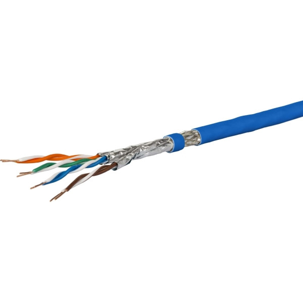25 GBit / 10 GBit Installationskabel, simplex, paargeschirmtes Installationskabel Cat.7, A AWG 22 S/FTP4 Paare (PiMF), Paarschirm: Kunststoff-Verbundfolie, Aluminium beschichtet, Gesamtschirm: Cu-Geflecht verzinnt, Kabelaußendurchmesser 7,5 - 8,1 mm, Kabelmantelfarbe: blau, Kopplungsdämpfung größer gleich 85 dB, elektrische Daten getestet bis 1500 MHz, GHMT Cat.7, A PVP zertifiziertGeltende Normen: EN 50173-1, ISO/IEC 11801, EN 50288-9-1 und IEC 61156-5, Kabelmantel LSHF-FR (LSOH-FR), Flammwidrigkeit: IEC 60332-1, IEC 60332-3-24, IEC 60754-2 und IEC 61034, Brandverhalten: Klasse D, ca s2 d2 a1 nach EN 50399 (Klassifizierung nach EN 13501-6)Liefereinheiten: auf Trommel - Meterware, 500 m und 1000 m , als Kabelring - 100 m