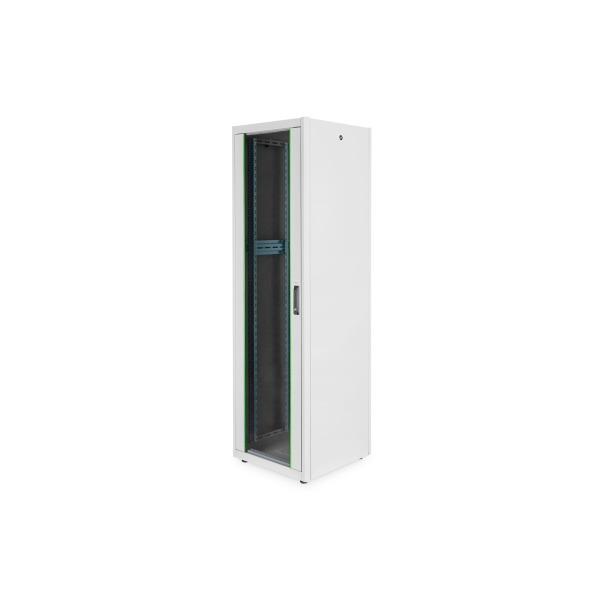 /6-D 42HE Netzwerkschrank, Dynamic Basic 2040x600x600 mm, Farbe Grau (RAL 7035) Die DIGITUS® Dynamic Basic Serie ist für die hohen Anforderungen der IT-Infrastruktur hergestellt, konzipiert und entwickelt worden - Dach ist vorbereitet zur Aufnahme eines Lüfterelements (ausgestanzte Aufnahmen) - Abschließbarer Schwenkhebelgriff an der Fronttür - Boden mit ausgestanztem Kabeleinlass, abgedeckt mit verschraubter Platte Die Schränke der Dynamic Basic wurden für den benutzerfreundlichen Einbau von aktiven- und passiven Netzwerkkomponenten einhergehend mit einer sauberen Verkabelung entwickelt. Jeder Schrank wird aus bis zu 1,5 mm starkem Stahlblech gefertigt und sorgt auf Grund von spezieller Blechbiegetechnik als robuste Stahlkonstruktion für eine sehr gute Stabilität. Die Farbgebung erfolgt durch Pulverbeschichtung in den Farben Grau (RAL 7035) und Schwarz (RAL 9005). Im Sonderfall kann eine Demontage der Schränke erfolgen, um auch schwer zugängliche Aufstellungsorte zu erreichen. Die Türen lassen sich leicht demontieren, ein Türanschlagswechsel kann vorgenommen werden. Desweiteren ist das Dach vorbereitet für die Aufnahme eines Lüftermoduls zur aktiven Entlüftung. Die Schränke beinhalten 2 Paare (4 Stück) montierte 483 mm (19?)-Profilschienen im Inneren. Diese sind galvanisiert und mit einer Markierung der Höheneinheit versehen (zählbar in beide Richtungen). Sie lassen sich in der Tiefe verstellen und sind zusätzlich mit Tiefenstreben im Schrank verbunden um so einen intensiven Ausbau mit 483 mm (19?)-Komponenten zu ermöglichen. Ein wichtiger Aspekt bei der Installation ist das Kabelmanagement. Jeder Schrank ist ausgestattet mit einem ausgestanzten Kabeleinlass mit Abdeckplatte im Boden. Der Boden bei Schränken ab 800 mm Breite wird zusätzlich erweitert mit ausgestanzten Kabeleinlässen mit Kunststoffabdeckung links und rechts. Im Dach befinden sich diese 1x bei Schränken mit 600 mm Breite und 3x ab 800 mm Breite. Ein umfangreich erhältliches Portfolio an Zubehör für die Kabelrangierung, Fachböden, etc. hilft viele Anforderungen der täglichen Praxis zu erfüllen. - Schutzklasse IP20 - Fronttür aus seitlichen Metallstreben mit Sicherheitsglas - Verschluss-System mit Schwenkhebelgriff an Fronttür - 120° Türöffnungswinkel - 1-Punkt-Verriegelung an der Fronttür - Rückwand und Seitenwände sind abschließ- und abnehmbar - inkl. 4 Stück Nivellierfüße, welche bereits unter dem Schrank angebracht sind - 483 mm (19?)-Profilschienen an der Vorder- und Rückseite innerhalb des Schrankes montiert, galvanisiert - 483 mm (19?)-Profilschienen sind in der Tiefe verstellbar und mit Markierung der Höheneinheit versehen - Boden mit ausgestanztem Kabeleinlass, abgedeckt mit verschraubter Platte - Ausgestanzte Kabeleinlässe mit Kunststoffabdeckung im Dach - Dach ist vorbereitet zur Aufnahme eines Lüfterelements (ausgestanzte Aufnahmen) - Diverse Erdungspunkte im Schrank für Einbaukomponenten - Inkl. Installations-Set (Schrauben, Käfigmuttern, Unterlegscheiben) - Lieferung erfolgt komplett montiert - Einbautiefe für Komponenten min.-max.: 290-550 mm