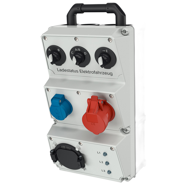 MENNEKES Prüfbox Generation 2 für Ladesysteme zur Funktionsüberprüfung von Ladestationen Zum Anschluss der Prüfbox kann das fest angeschlagene Ladekabel (Typ 2) einer Ladestation, ein Mode 3 Ladekabel oder ein Prüfkabel Generation 2 (mit Ladestecker und Ladekupplung) verwendet werden. Ein Prüfkabel liegt der Prüfbox nicht bei, kann bei Bedarf aber separat bestellt werden. Formschönes, robuster Kunststoff Gehäuse aus AMAPLAST im AMAXX Design mit Tragegriff plombierbar, mit Aussen-u.Innenbefestigung Schutzgrad IP 20 Abmessungen 390 x 225 x 165 (HxBxT) Oberteil elektrograu RAL 7035 Unterteil schwarz seitlich anscharniert mit Doppelgewinde-Deckelschrauben Bestückung/Absicherung: Pos.1: 1 Schutzkontaktsteckdose (Typ F) Pos.2: 1 CEE-Steckdose 16A 5p 400V Pos.1+2: 1 LS-Schalter 16A 3p+N C 1 Fahrzeugladestecker 32A Mode 3 mit Klappdeckel weitere Einbauten: 3 Drehschalter 3 Phasenkontrolleuchten Widerstands-Dioden-Kombination Folgende Prüfungen können durchgeführt werden: 1. EIN / AUS Schalter (State A / B) 2. Simulation von nicht gasenden und gasenden Fahrzeugen. Laden mit und ohne Lüftungsanforderung (State C / D) 3. Fehlermeldung des Elektrofahrzeugs Kurzschlusses zwischen CP und PE (State E) 4. Simulation einer Wechselstromlast 5. Simulation einer Drehstromlast. Kann zur Kontrolle des Drehfeldes genutzt werden 6. Ladestecker zum Anschluss an einen Mode 3 Ladepunkt 7. Kontrollleuchten zur Phasenkontrolle (State A bis E = Fahrzeugzustände nach Norm)