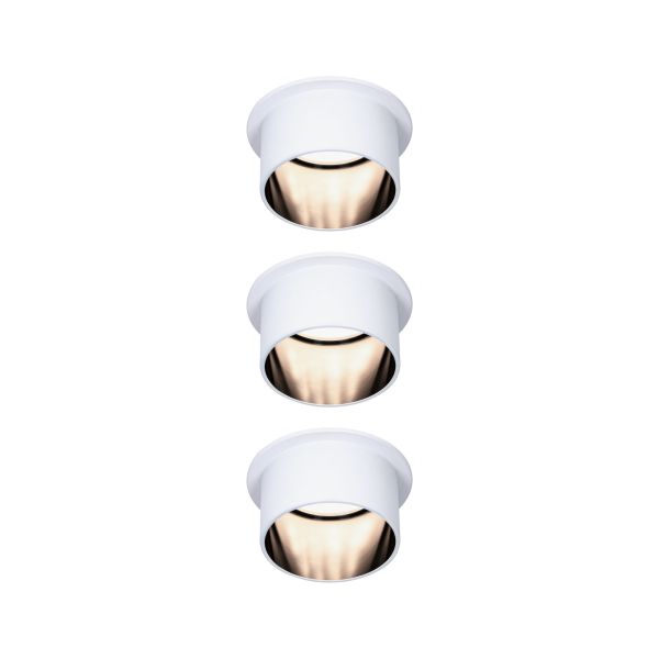 Die dekorativen Einbauleuchten Gil im 3er-Set in der Farbe Weiß matt#Schwarz matt sorgen mit ihrem zweifarbigen Design für Lichthighlights und setzen blendfreie Akzente an der Decke. Durch den hervorstehenden Dekozylinder wird eine geringere Einbautiefe im Vergleich zu den zurückgesetzten Lichtpunkten benötigt. Hat man sie entdeckt, möchte man gar nicht mehr wegschauen. Die Strahler punkten mit brillanter Technik: Die wechselbaren LED Coins liefern angenehm warmweißes Licht, lassen sich mit einem herkömmlichen Lichtschalter in drei Stufen dimmen und sind untereinander unendlich verkettbar. Sie benötigen einen Bohrdurchmesser von 62 mm. Mit handelsüblichem Lichtschalter in 3-Stufen dimmbar Inkl. auswechselbarem LED Leuchtmittel Farbtemperatur: 2700K - Warmweiß Für den 230V-Direktanschluss Set aus 3 Leuchten
