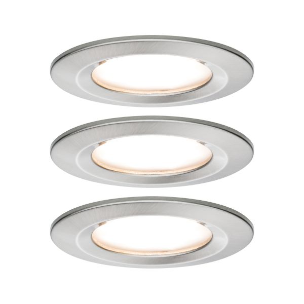 Die runden Nova Plus Einbauleuchten (3er-Set) in Eisen gebürstet mit tauschbarem LED-Coin, eignen sich sowohl für Neuinstallationen als auch für den Austausch bestehender Installationen. Sie sind besonders flach und können deshalb in Decken mit einem Hohlraum von nur 30 Millimetern eingebaut werden. Durch die Verkettung der Einzelleuchten mittels Schnellklemmen, lassen sie sich schnell und einfach einbauen. Die Dimmfunktion ermöglicht eine individuelle Anpassung der Helligkeit und sorgt für warmweißes Arbeitslicht und gemütliche Wohlfühlbeleuchtung in einem. Mit ihrem IP44-Spritzwasserschutz sorgen die Leuchten auch im Badezimmer und in der Küche für wohnliches Licht. Set aus 3 Leuchten inkl. LED-Modul Farbtemperatur: 2700K - Warmweiß Mit satiniertem Schutzglas Sehr flach - der Einbau ist auch bei geringen Hohlraumtiefen von nur 30 mm möglich Für den 230V-Direktanschluss Inkl. Anschlussbox mit Doppelschnellklemme zum Durchschleifen IP-Schutz: IP44 - spritzwassergeschützt Dimmbar