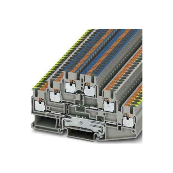 Schutzleiter-Reihenklemme, Nennspannung: 500 V, Nennstrom: 20 A, Anschlussart: Push-in-Anschluss, 1., 2. und 3. Etage, Bemessungsquerschnitt: 2,5 mm², Querschnitt: 0,14 mm² - 4 mm², Montageart: NS 35/7,5, NS 35/15, Farbe: grau