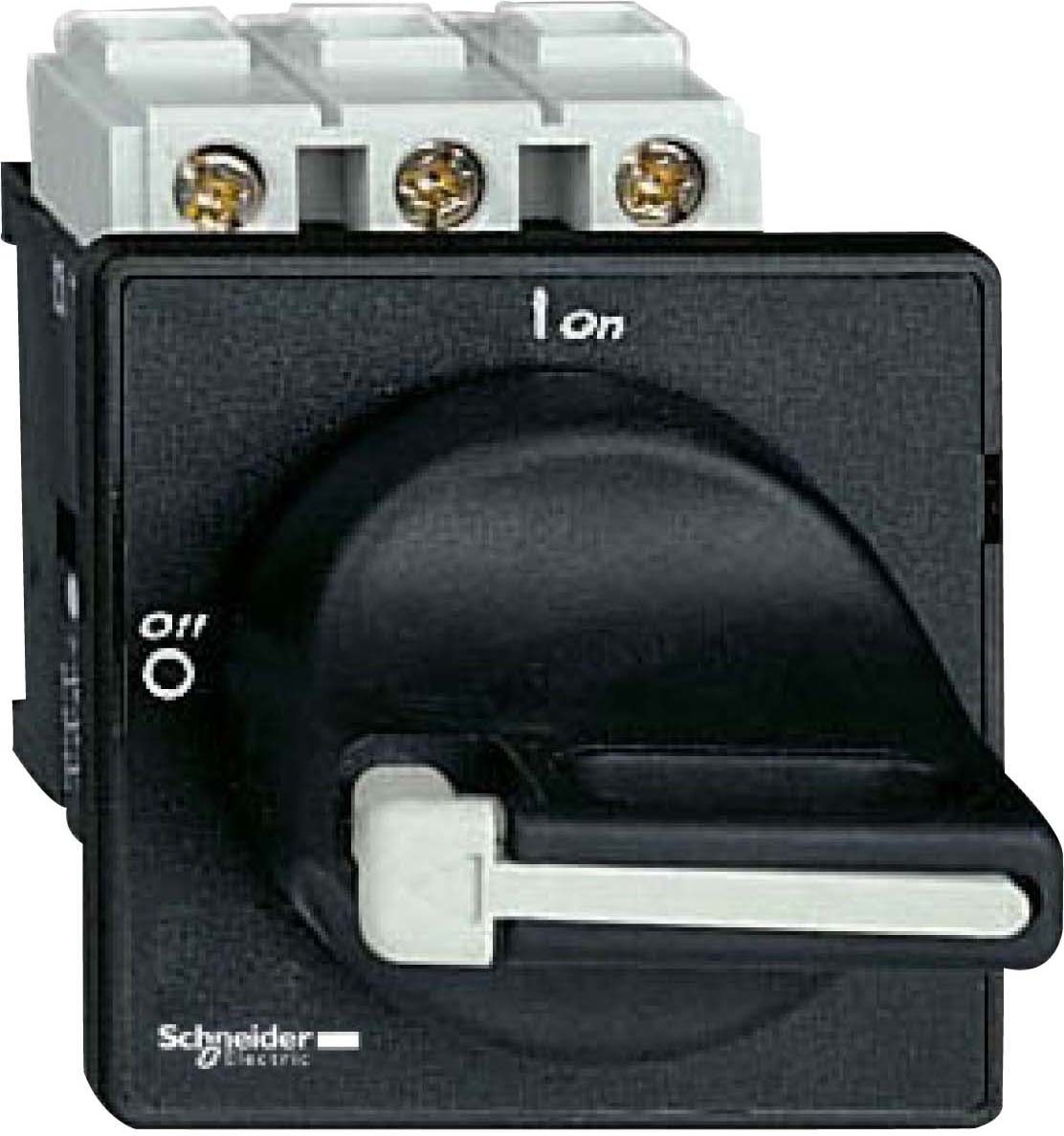 Hauptschalter, 3P, 690V, 25A, Im Gehäuse. Baugroesse_A 32 A, Befestigung 4 Schrauben, Frontschild 60 x 60 mm. Komplettgerät, 3-polig, IP 65, mit Drehantrieb. Für Befestigung in der Schaltschranktür. Schwarzer Griff, abschließbar mit 3 Vorhängeschlössern DM 4 mm bis DM 8 mm. (Lieferung ohne Vorhängeschlösser) Schalterstellung O I, Frontschild schwarz. Vierlochbefestigung.