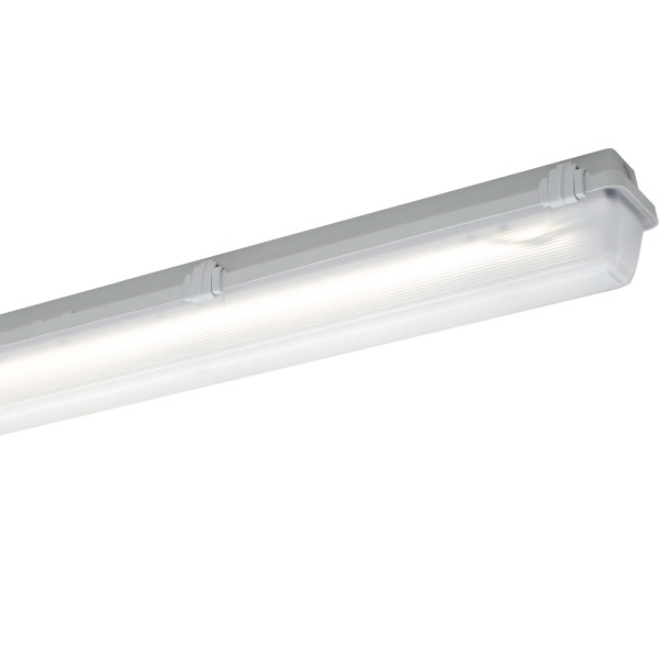 LED-Feuchtraum-Wannenleuchte, 27 W, 4240 lm, SKI, IP65, symmetrisch-breitstrahlend, 4000 K, Ra= 80, Ta -20 °C/+40 °C, L80>70000 h (@ Ta max), L90>50000 h (@ Ta 25°C), Wanne PMMA satiniert, Verschluss Kunststoff, Gehäuse glasfaserverstärktes Polyester, Farbe grau, für ungeschützte Außenbereiche, EAN/GTIN:4041254258034.Robuste LED-Feuchtraum-Wannenleuchte für ungeschützte Außenbereiche. Hochschlagfestes glasfaserverstärktes Polyestergehäuse, satinierte PMMA-Abschlusswanne mit hoher Schlagfestigkeit und UV-Beständigkeit. Mehrteilige unverlierbare Verschlussklammern, davon zwei Sicherheitsverschlüsse, Silikondichtung und Druckausgleichselement. Lackierter Aluminiumreflektor mit hocheffizienten Zhaga-konformen LED-Modulen und EVG mit Überlast- und Kurzschlussschutz.