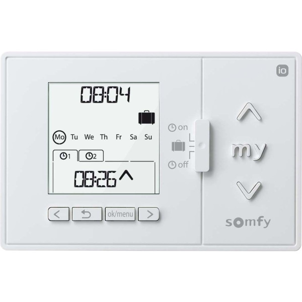 Chronis io dient der zeitbasierten Automatisierung von z. B. Rollläden, Raffstoren, Markisen oder Beleuchtungsprodukten. Es steht ein Kanal für ein Produkt bzw. eine Produktgruppe zur Verfügung. Individuelle Öffnungs- und Schließzeiten für jeden Wochentag mit bis zu 4 Schaltzeiten sind einzeln programmierbar. - Großes Display mit hellblauer Hintergrundbeleuchtung für eine maximale Lesbarkeit - Copy-Paste Funktion (um die Zeiten bequem von einem Tag auf die anderen zu übertragen) - Cosmic-Programm (abends): Schließen entsprechend der vorgespeicherten (und veränderbaren) Sonnenuntergangszeiten - Drahtlos / batteriebetrieben - Unbegrenzter Erhalt der gespeicherten Schaltzeiten auch bei Batteriewechsel Lieferumfang: Funkprogrammschaltuhr inkl. Wandhalterung, Batterien Betriebsspannung: 2 x 1,5 V DC (Batterie Typ Micro/AAA) Betriebstemperatur: 0 °C bis 60 °C Schutzart /Schutzklasse: IP 20 / III Sendefrequenz: 868,95 MHz, io-homecontrol® Funkreichweite: 20 m durch zwei Betonwände Maße (BxHxT): 120 x 80 x 21 mm