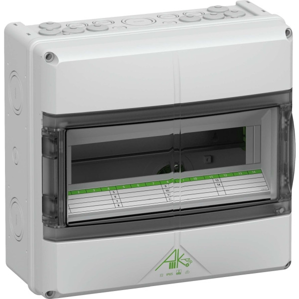 Kleinverteiler, mit Schutzart IP65, 1-reihig, 14 verfügbare Teilungseinheiten, mit integrierten Belüftungselementen zur Verminderung der Kondenswasserbildung, Bemessungsbetriebsspannung: 400V AC, Bemessungsisolationsspannung: 1000V AC, 1500V DC, zertifiziert durch VDE (DIN EN 60670-1/-24 (VDE 0606-1/-24)), UL-EU (EN 62208), UL-EU (EN 61439-1/-2), UL-EU (EN 61439-1/-3), UL-EU (EN 61439-1 & EN IEC 61439-7), DLG (Ammoniakbeständigkeit), oben und unten metrische Vorprägungen für universelle Leitungseinführungen mit Kabelverschraubungen und / oder Doppelmembranstutzen, oben mit elastischen Einführungen DMS M20 vorbestückt, mit schraubenloser PE/N-Klemmschiene mit jeweils 3 schraubbaren Klemmstellen 2,5-16mm² und 14 schraubenlosen Klemmstellen 1,5-4mm²